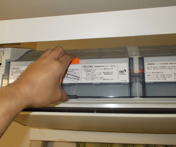 エアコン前面のオープンパネルを外してダストボックスのお手入れをしましょう。