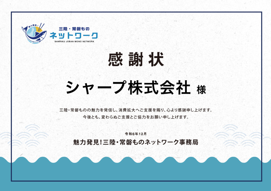 こうした支援活動に対し、このたび三陸・常磐ものネットワーク事務局から感謝状をいただきました。
