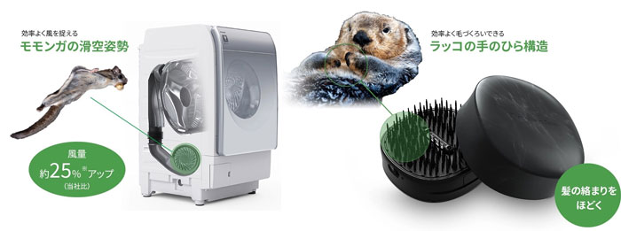 ※ 送風経路と吹き出し口の面積アップとの組み合わせによる。標準コース(洗濯~乾燥6㎏)で実施。 モモンガ構造採用モデルES-X12C/V12C:2.25m³/分、非採用モデルES-X11B:1.79m³/分。