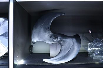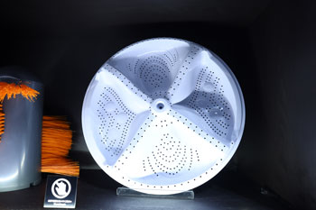 タテ型洗濯乾燥機用のパルセーターは、表面にはイルカの表皮のしわを、裏面に尾びれを応用した形状を採用しています。第二世代ではイルカの尾びれ形状が2カ所から4カ所に増え、かき混ぜる力が強化されました。第三世代は、尾びれを応用した流線形の傾斜面が強い水流を作り、衣類の上下移動を促進します。イルカの尾びれ形状と、その尾びれを上下に蹴りだすリズム(ドルフィンキックパターン)を活用し、左右回転と上下の運動を組み合わせることで、衣類の入れ替わりを促し、洗浄効率を向上させ、洗浄時間を短縮しました。