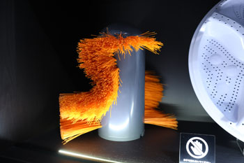 イカの遊泳方法から着想した当社独自の「イカブラシ」は、ヒレを巧みに使って前後自在に泳ぐイカのヒレ形状を応用しています。波形状のイカブラシにより靴が1カ所に集まるのを防ぎ、ブラシが靴に満遍なく接触することで、靴全体をしっかりと洗浄できます。