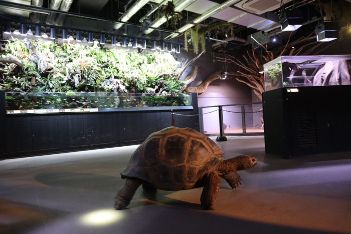 餌を探して、部屋の中を自由に散歩するアルダブラゾウガメ