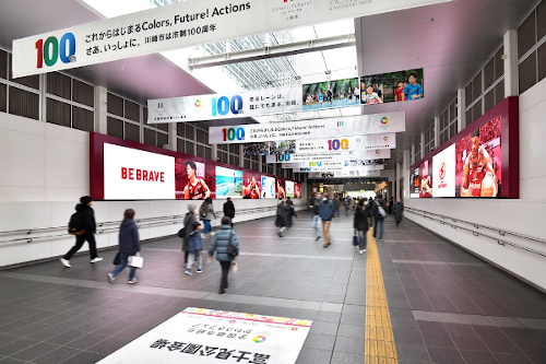 JR川崎駅北口通路の事例は、「THE KAWASAKI VISION(ザ カワサキ ビジョン)」という名称で、公募で選ばれた株式会社DeNA川崎ブレイブサンダースさまが運営しています。