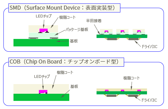 COBはLEDを基板に実装したあと、表面に樹脂をコーティングする方式で、物理的衝撃などに対してLEDを守る効果があり、人通りの多い商業施設などでも採用されています。一般的にはCOBはSMDより発光効率が良く、低消費電力を実現します。樹脂でコーティングするので横から見ると表面が平らになっています。