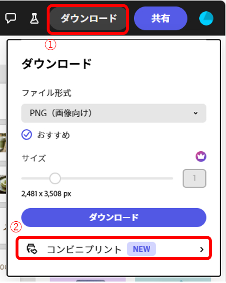 「Adobe Express」画面右上の①「ダウンロード」→②「コンビニプリント」をクリックして、「コンビニ」の一覧から、プリントしたいコンビニを選択します。(別のコンビニを利用する場合はこちらの操作を再度実行する必要があります)