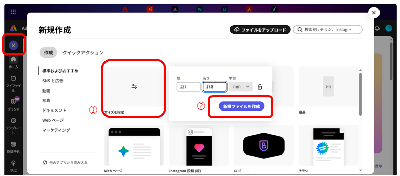 Adobe Expressホーム画面左上の青いプラス(十字)のボタンをクリックすると新規作成画面が表示されます。①「サイズを指定」をクリック、作成する用紙のサイズを設定します。