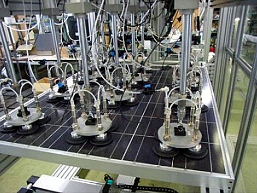 →台風の多い日本では強風に対する不安は大きく、また豪雪地域も多いため、太陽電池モジュールに、強風や積雪の負荷を想定した高い荷重を加える「機械的荷重試験」を実施しています。また、長期にわたる高温・高湿使用による材料の劣化や、太陽電池モジュールの絶縁不良、電気出力の低下の影響を想定した「高温高湿試験」や、高温高湿度に加え結露や霜、凍結の繰り返しを想定した「結露凍結試験」も実施しています。
