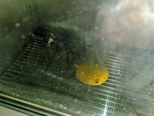 →積乱雲から約時速30kmで降ってくる直径5mm以上の氷塊である雹(ひょう)などにも耐えうる設計とするため、鋼球を1m以上の高さから落下させる「鋼球落下試験」を実施。また、四方を海に囲まれた日本では、塩害対策も必須のため、「複合サイクル腐食試験」によって、塩分による腐食や電食(電気化学反応による腐食)に対する耐久性も確認しています。