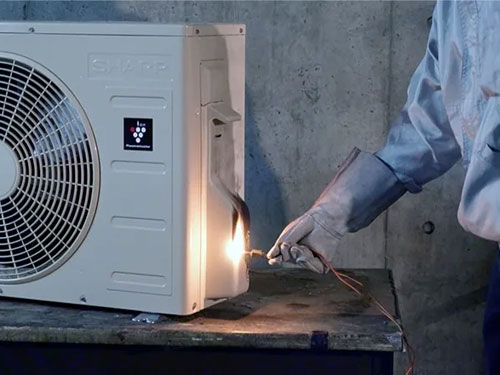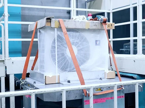 →輸送時の振動を想定し、製品への影響がないことや、屋外での災害を想定し、室外機に火が燃え移っても燃え広がらないことを確認します。
