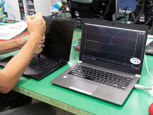 ノートPCに求められる高い堅牢性と耐久性を実現するため、厳しい評価基準を設け試験を行っています。