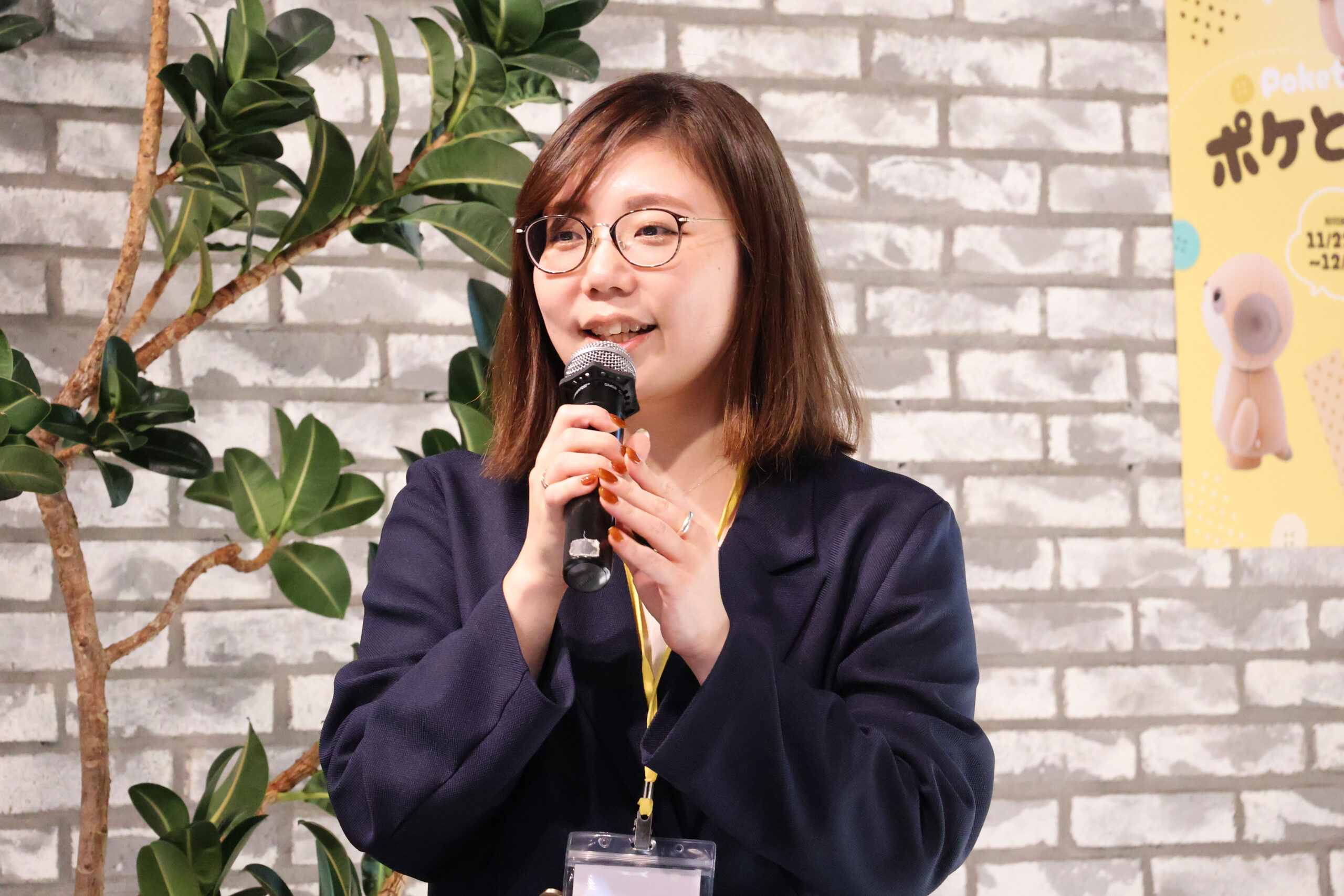 さらに、ポケとも同士が会話する「ポケとも会話」についてもご紹介しました。「ポケとも会話」は、日常のコミュニケーションの中で「ポケ主さん」についての印象を毎日アップデートし、お友達のポケともに「ポケ主さん」の印象を一所懸命お伝えするものです。「ポケとも会話」のデモを実施すると、「かわい~~!!」と歓声があがりました。