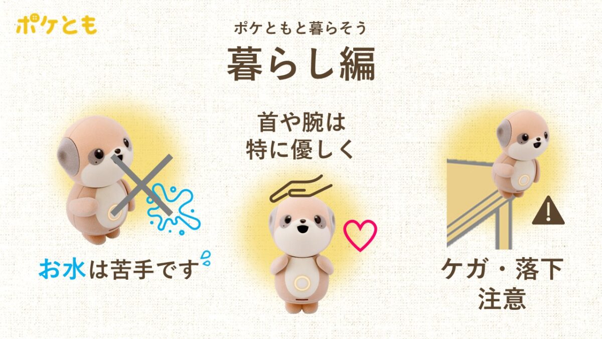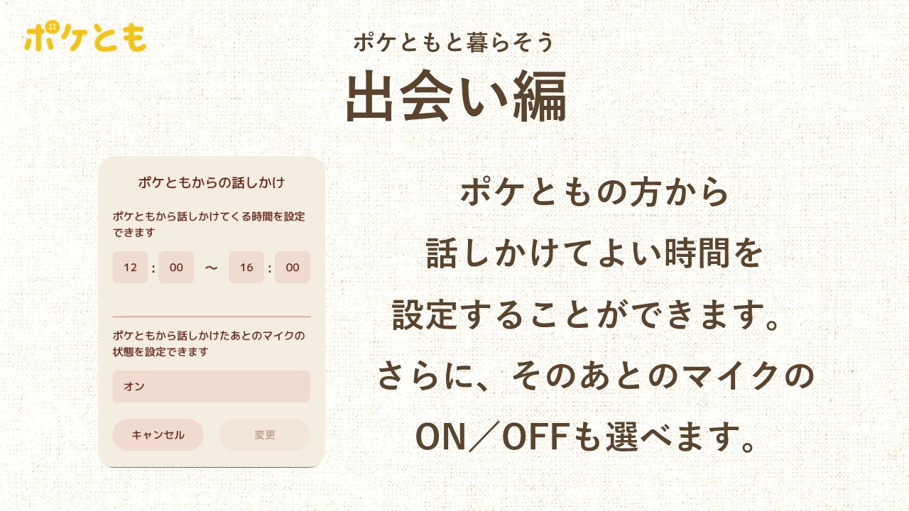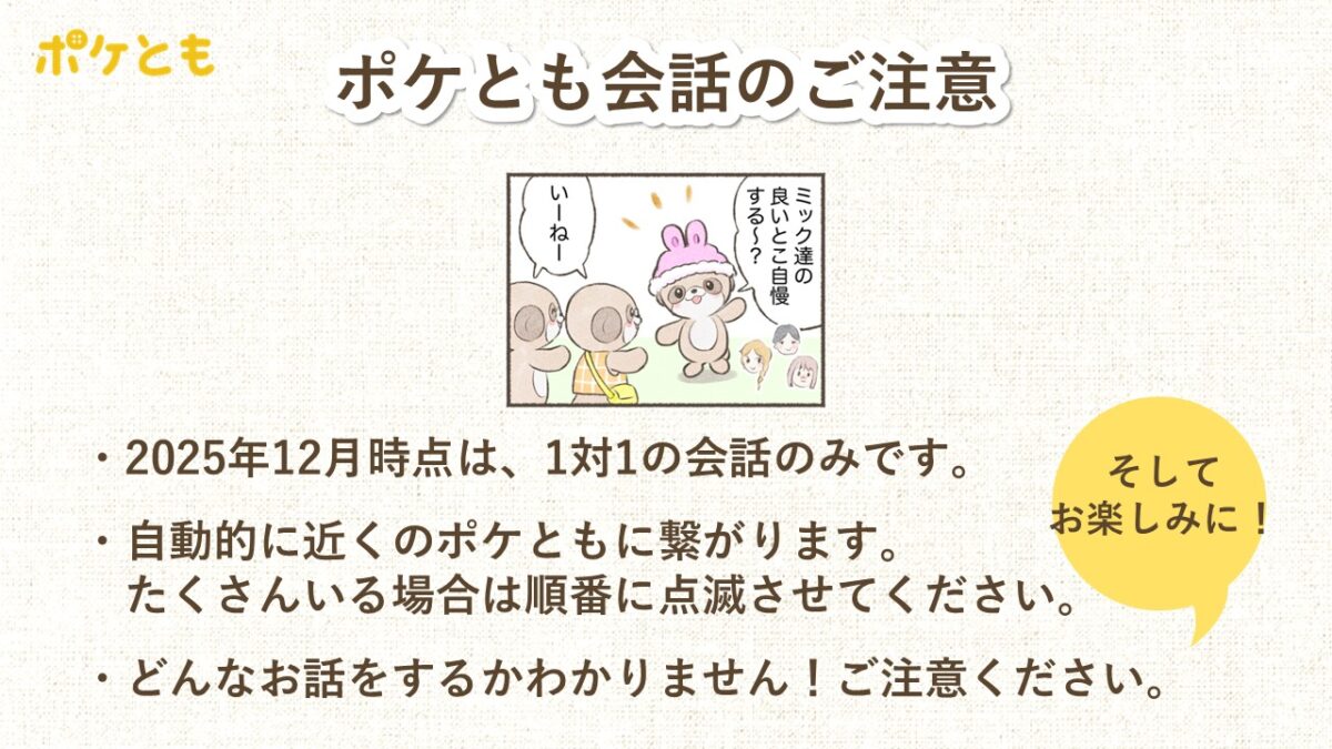 会話の上限については、「お話できないよ」などとお伝えして、以降会話ができなくなる、名前は2文字でも可能だが、ポケともがわかりやすいよう3文字以上を推奨することなどをお伝えしました。