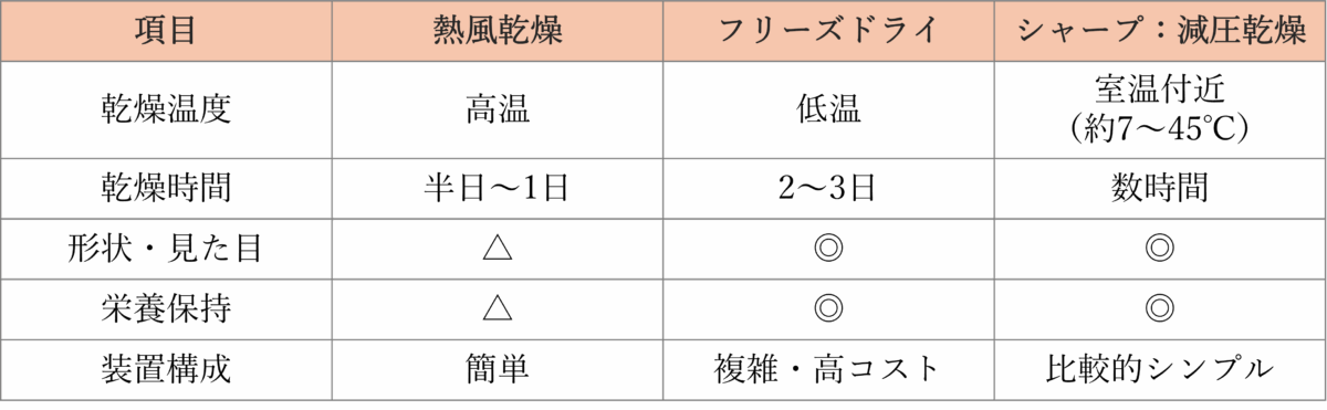 乾燥方式にはそれぞれ強みと適性があります。用途や狙いの品質に応じた選択が重要です。シャープの「高品位減圧乾燥技術」は、低温・短時間・見た目と栄養の保持をバランスよく追求するアプローチです。