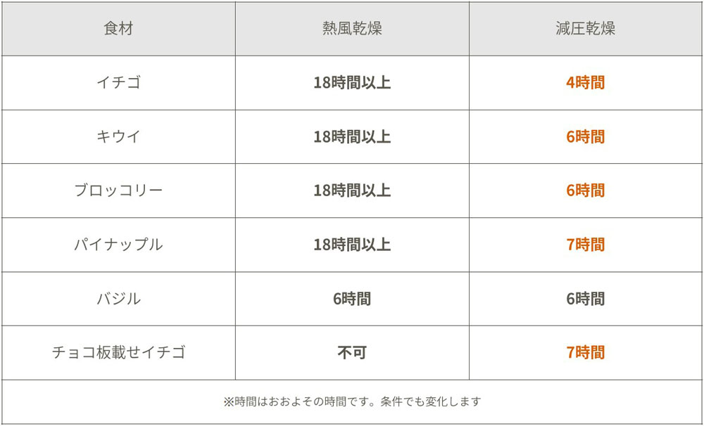 熱風乾燥で起こりがちな縮みや硬くなる変化を抑え、元の形や食感を保ちやすくなります。