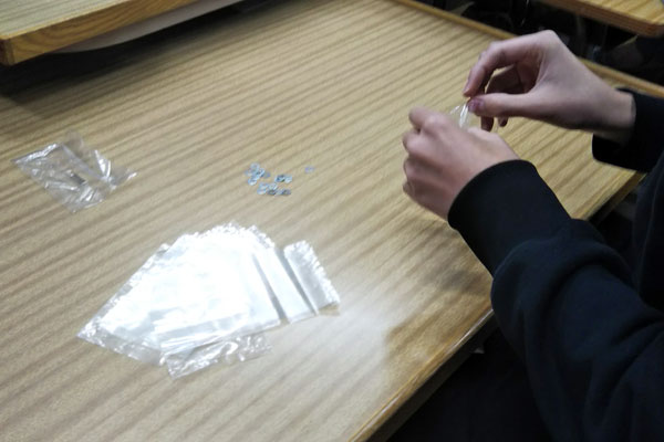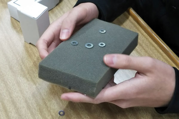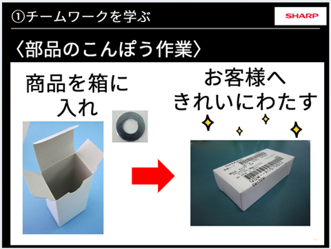 シャープ特選の吉永と関守が講師となり、「部品の梱包作業」を生徒全員で行いました。テープ留めや部品の袋詰め、ラベル貼り等の役割分担や作業手順を各自で考えてもらった後、作業をスタート。普段の授業ではあまりない、全員で協力しての作業で、チームワークの大切さを体験しました。