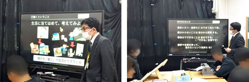 働く目的や意義を説明し、イメージを持ってもらいました。続けて、社会で働く上では、挨拶や返事、規則正しい生活、礼儀やマナーが大切であること、そして、できることを自分ですることの必要性を伝えました。