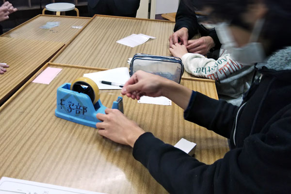 (岸本 先生)作業体験がすごく良かったです。5人が意見を出し合って、僕はこれをする、私はあれをすると、自然に声が出ていましたし、C課程の生徒には、テープやシールを貼るのは、とても難しい内容でしたが、AとB課程の生徒と協力していました。1つ梱包するのも大変なのに、10個もできたというのは、すごく達成感があったと思いますし、1人では難しくても、グループで協力したらできるという成功体験にもなったと思います。C課程の生徒はこの作業は難しいのではないかと心配していましたが、打ち合わせ時、シャープ特選の吉永さんに、協力して一つのものをやることがこの作業体験の趣旨と言っていただき、それならば、と5人全員でやらせてもらいました。本当に良い経験になりました。