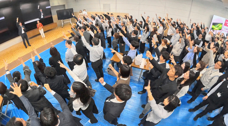 10月31日(金)、堺事業所本社事務棟・多目的ホールにて労使合同イベント「堺フェスティバル」を開催しました。 冒頭、代表取締役社長CEO 沖津さんと、シャープ労働組合 本社直轄支部 委員長 新納さん、シャープ労働組合中央