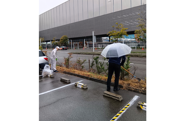 第3回となる今回は、第1回で整備した場所のメンテナンスを目的とした「草刈り」、会社の”顔”となる「エントランスの清掃」、そして「花壇作り」の3つの活動を、グループに分かれて行いました。 当日はあいにくの雨となり、「草刈り」は中止の予定でしたが、傘を差しながら駐車場の溝清掃や会社周辺のごみ拾いに自主的に取り組む参加者の姿も見られました。