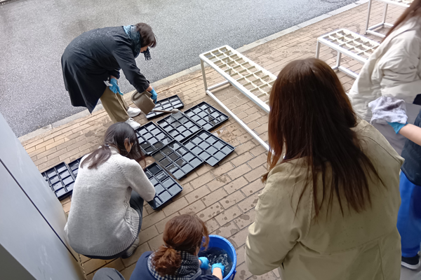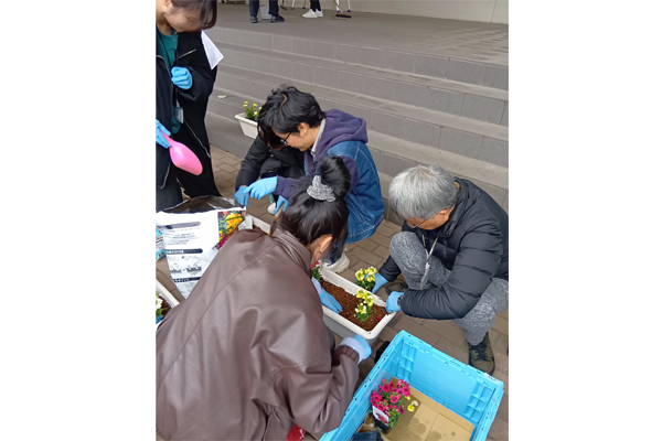 花壇作りでは、和気あいあいとした雰囲気の中で作業が進められ、色とりどりの花が並ぶ花壇が完成しました。完成した花壇は、エントランスや従業員入口付近に設置されています。