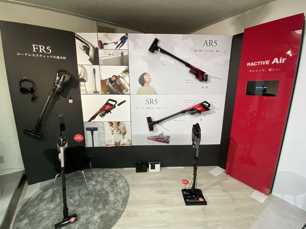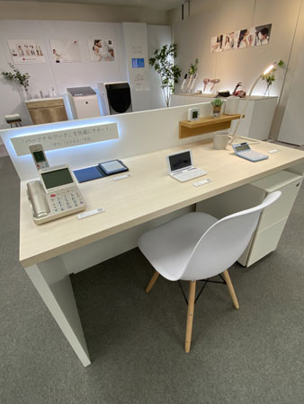 八尾事業所の事務棟1階、お客様をお出迎えする玄関口のすぐ横にはショールームがあり、常に当本部の最新の商品を展示しています。これまでは、量販店の店頭のようにPOPを貼付した商品を陳列していたのですが、デザインスタジオの皆さんのご協力のもと、展示方法を一新してリニューアルしました。