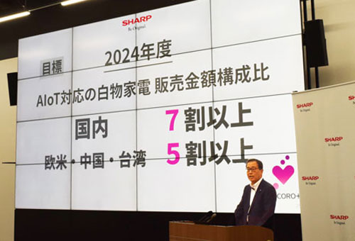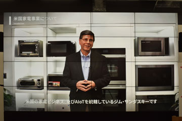 続いて、台湾と米国でのAIoT家電の取り組みについて、アジアスモールアプライアンス事業部 事業部長の呉國賢(サム・ウー)さんとSEC家電本部 本部長のJames Sanduski(ジム・サンダスキー)さんのビデオメッセージで紹介。その後、沖津さんより2024年度に国内AIoT家電(テレビを含む日本国内のAIoT対応家電)のネット接続率を8割以上とすること、AIoT対応の白物家電の販売構成比(金額)を2024年度に国内で7割以上、欧米・中国・台湾では5割以上を目指すという2つの目標を表明しました。