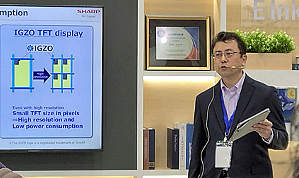 そして、4月21日には、SDTC 開発本部 次世代技術開発統轄部 第二開発部長の中村さんがE Ink内のメインブース裏側のフォーラム会場に登壇し、SDTCの概要やIGZO技術、E Inkとのコラボレーションの内容について約15分間の講演を行いました。