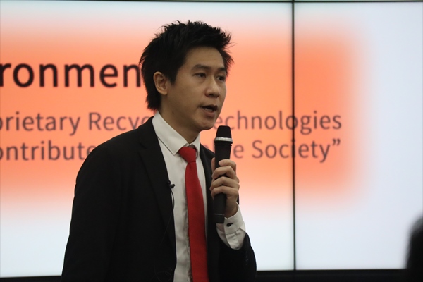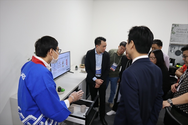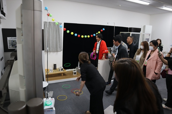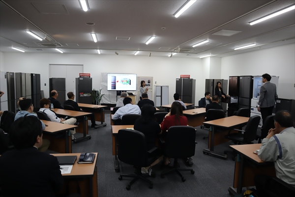 八尾事業所の集会室にて、SAS事業本部長の菅原さんがウェルカムスピーチを行いました。次に、副本部長のSam Wuさんが、SAS事業本部のAIoTをはじめとした独自技術の取り組みについてのプレゼンテーションを行いました。