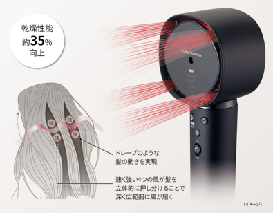2023年8月当社独自の速乾方式「ドレープフロー」がさらに進化、従来2つだった吹き出し口を4つに増やした「ドレープフロー X4(エクスフォー)」を開発し、スリムな新デザインに一新しました。