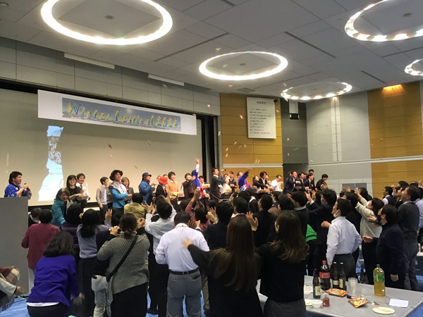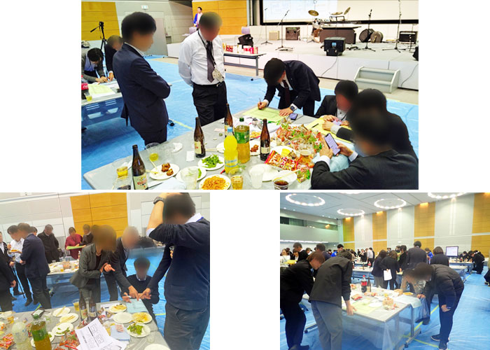 事業所管掌のユニバーサルネットワーク・ビジネスグループ長の中野さんによる乾杯に始まり、節分にちなんでステージ上から豆まきを行うとともに、従業員で結成する音楽バンド「Happy Hour」、「MOB」による演奏で会場が一体となって盛り上がりました。