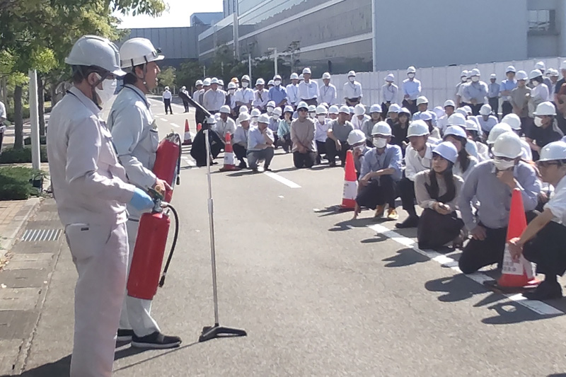 従業員の避難と安否確認が完了した後、株式会社大一商会の楳田さんから消火器の使い方についてのレクチャーがあり、実際に班員の数名で水の入った消火器での消火活動のデモンストレーションを行いました。
