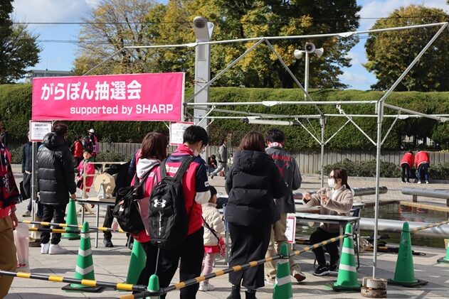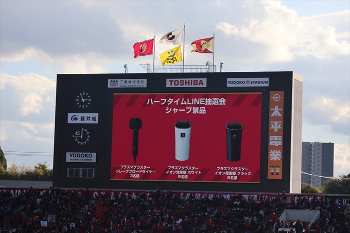 当日はスタジアムの大型電子掲示板で当社CMを放映しました。ハーフタイムには抽選会を実施して当社商品をプレゼント。また、電子看板やバナーを数多く掲出するなど、スタジアムをSHARP一色に染めました。