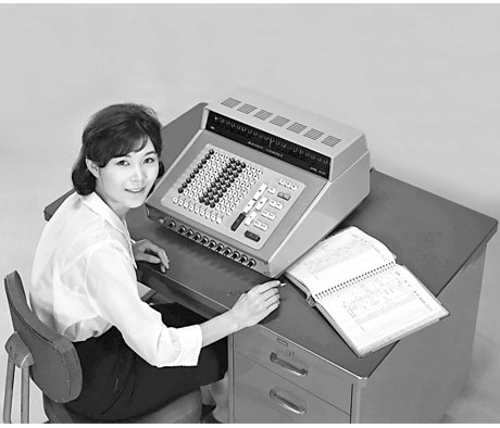 1964年、世界初のオールトランジスタ・ダイオードによる電子式卓上計算機を発売。 その4年前の1960年、若手技術者達の提案で、大型コンピュータでなく、「いつでも・どこでも・だれにでも」使える計算機の開発に取り組み成功しました。サイズは、幅420mm×奥行440mm×厚さ250mm、重さが約25kg、価格は当時1300ccの車とほぼ同じの535,000円でした。写真を見るとその大きさがよく分かりますが、事務や経理の大幅な効率化を実現する、夢のような商品でした。