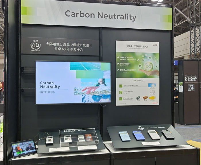 プレゼントキャンペーンを実施している電卓60周年記念モデルは、本体(上下キャビ、キートップ)へバイオマス樹脂※1を採用し、バイオペイント※2で仕上げたもの。シャープのCarbon Neutrality(カーボンニュートラリティ:温室効果ガス(特に二酸化炭素)の排出量を実質的にゼロにすること)への取り組み紹介として、「CEATEC 2024」にも参考出展しました。