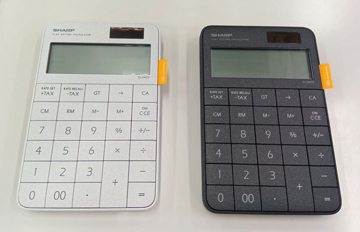 COCORO MEMBERSサイトでは、この電卓60周年記念モデルのプレゼントキャンペーン第2弾を実施しています。昨年ご好評いただいた第1弾キャンペーンではグリーン系とブルー系でしたが、今回はスタイリッシュなグレー系とブラック系の2種類をご用意。2024年に発売されたEL-VM72をベースとしたスマートなフラットフェースデザインに、マットで指触りの良い質感がとてもおしゃれな仕上がりです。また、押し心地のいいフラットな大型キー、見やすいディスプレイ表示、税計算・定数計算機能搭載など、デザインだけではなく機能面でも充実しています。