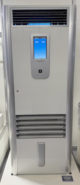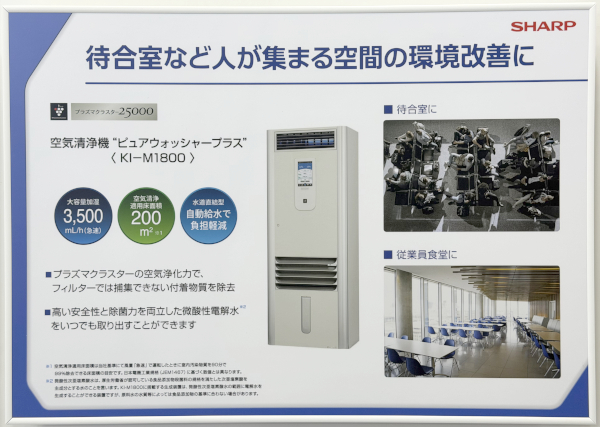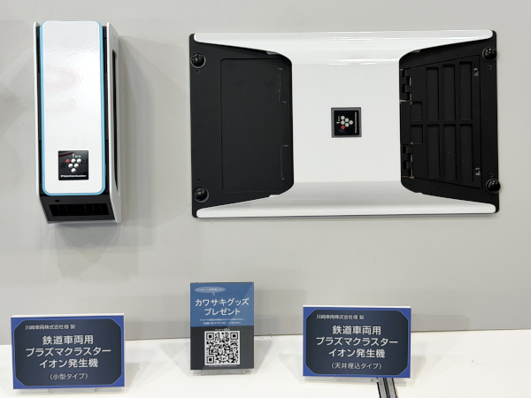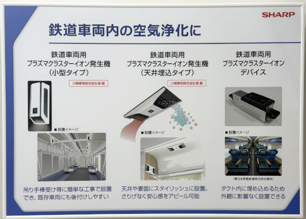 鉄道車両用のプラズマクラスターイオン発生機に加え、待合室などでの利用に適したプラズマクラスター加湿空気清浄機を出展しています。空気浄化に有効な高濃度のイオン空間を創出し、快適な空気環境を実現します。