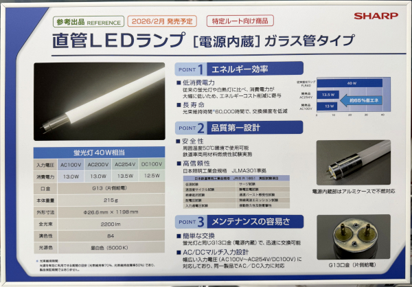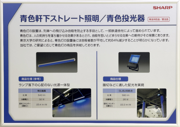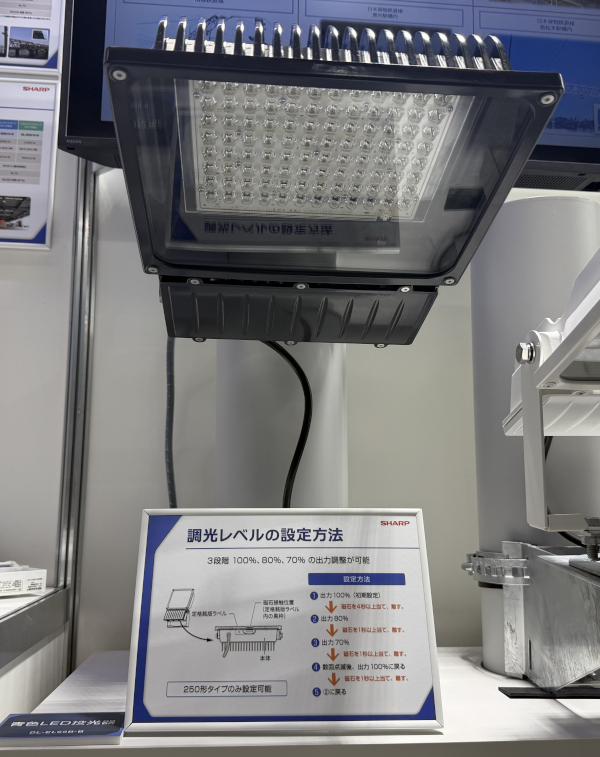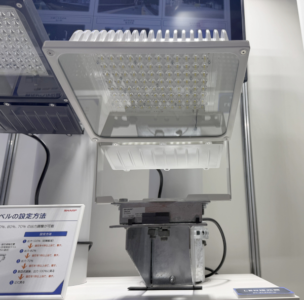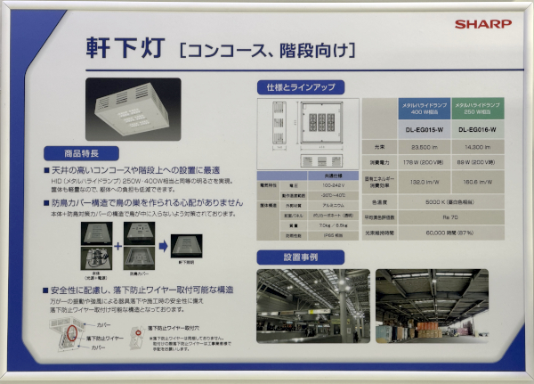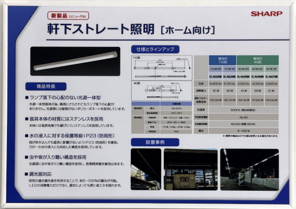 安全性の高い光源一体型の直付ストレート型(軒下用)照明や用途に合わせた配光選択で、さまざまな場所の照明として使用できる投光器などを展示しています。
