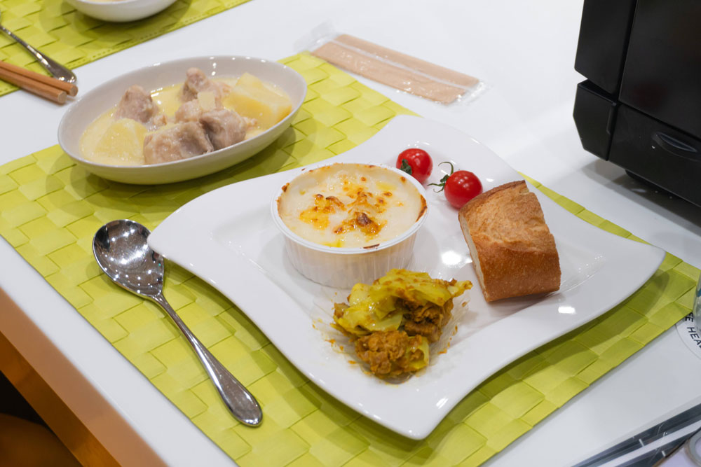 午前と夕方に実施した購入検討者向け教室では、ヘルシオとホットクックを使用し、複数のメニューを実際に調理し、試食していただきました。