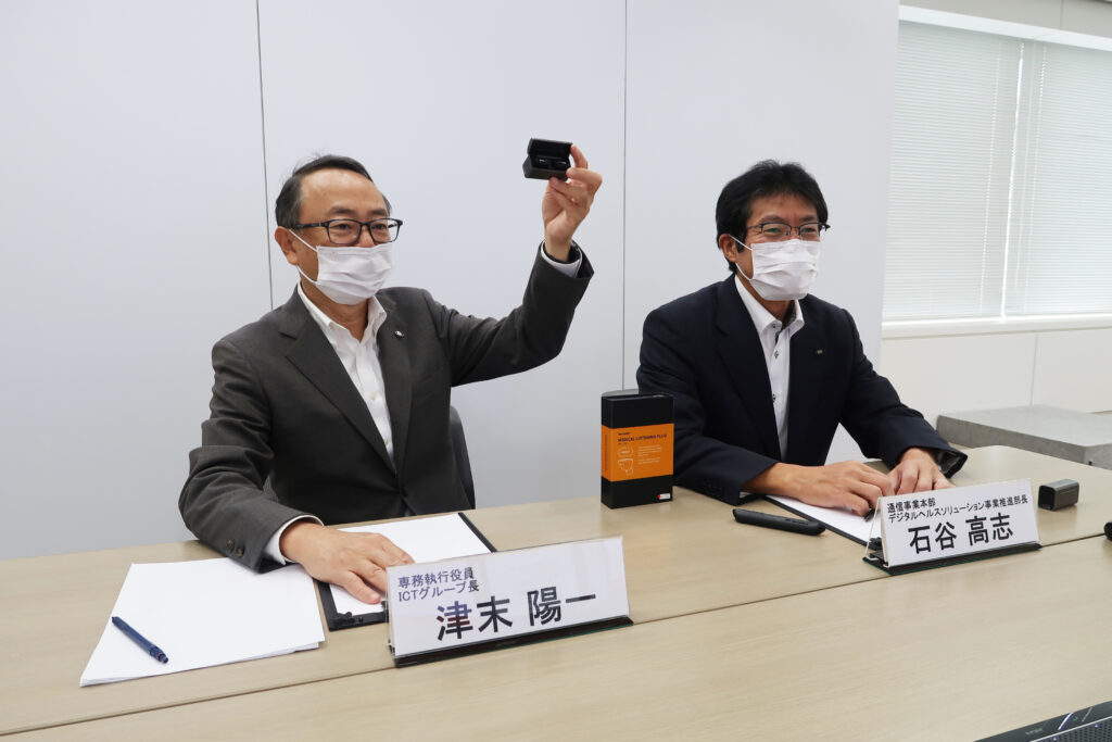最初に、専務執行役員 ICTグループ長 津末さんより、ICTグループにおける医療分野での取り組みについて、スマートフォン事業で得意とする「無線・通信技術」、「小型・省電力技術」や「AIoTクラウド技術」を活用し、ウェアラブルやモバイル機器を使った「オンライン診療ソリューション」に焦点をあて、事業化を進めている旨を説明しました。また、昨年6月、医療機器の開発や医療現場のニーズ・課題に精通する株式会社ニューロシューティカルズと資本業務提携し、第一弾として、ニューノーマル時代の社会課題にお応えする新しいスタイルの補聴器「メディカルリスニングプラグ」を商品化したことを説明しました。
