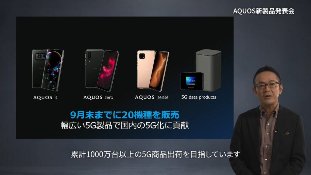 最初に、小林さんより、国内の5Gサービス開始から1年で、AQUOS全シリーズを5Gにしたことに加え、モバイルルーターやホームルーターにも商品分野を拡大し、これまでに20の5G機種を提供してきたことを紹介。2022年度末までに累計1,000万台以上の5G商品出荷を目指すことを表明しました。