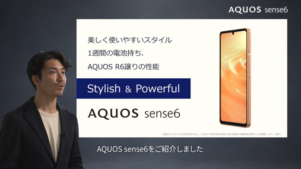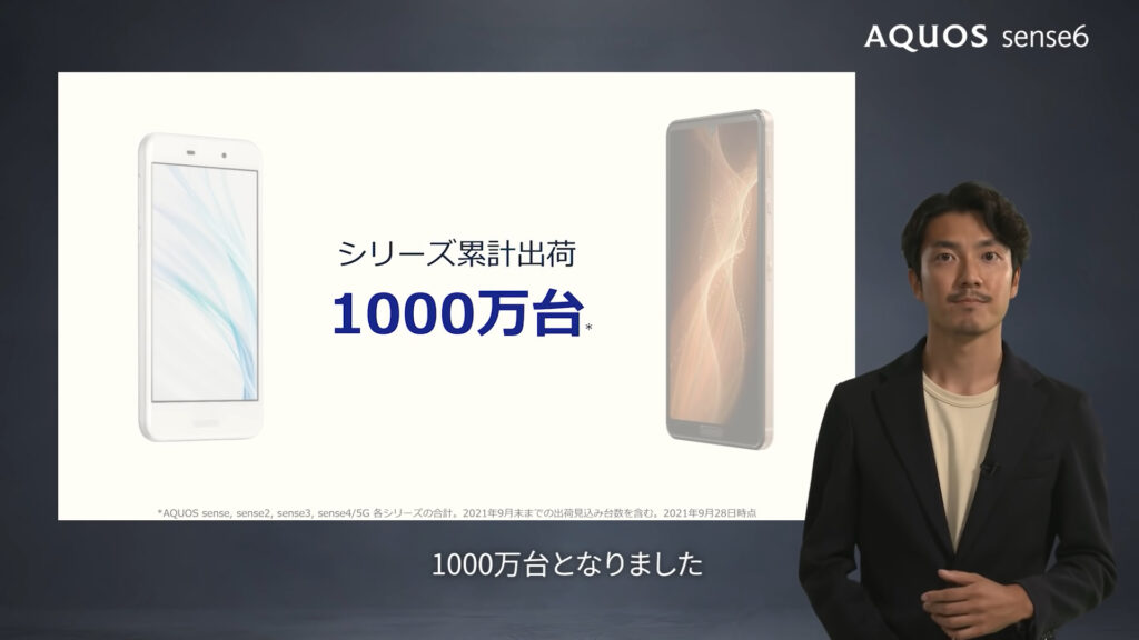 清水さんからは、「AQUOS sense6」について、スタイリッシュなデザインと1週間の電池持ちを両立したことを説明しました。また、「AQUOS sense」シリーズは、2017年の発売以来、本年9月末までに累計出荷1,000万台を達成することもあわせて表明しました。