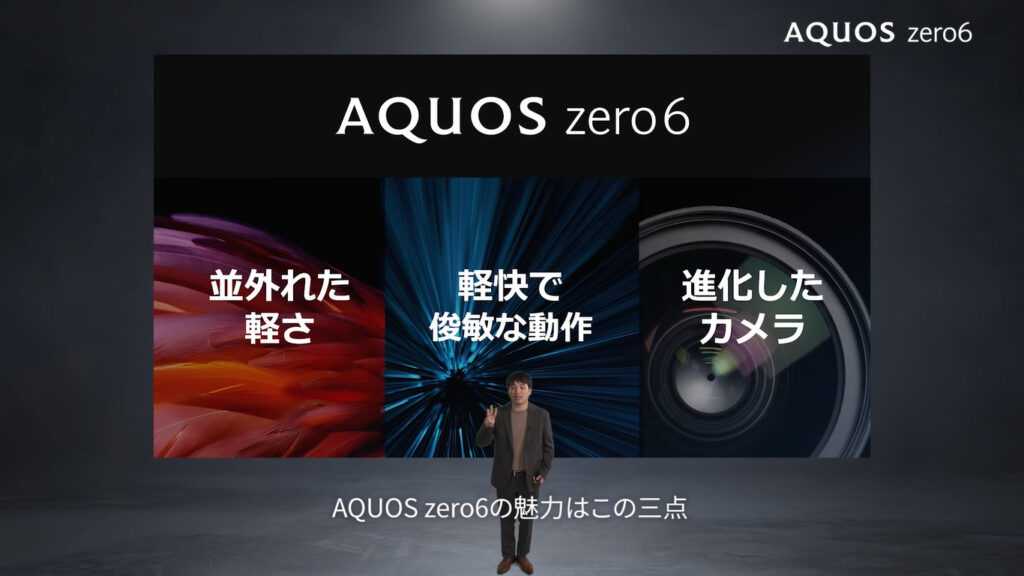 続いて、小山さんより「AQUOS zero6」について、充実した機能やスペックを備えながら、5Gモデルで世界最軽量約146gを実現し、一日中スマートフォンを使いこむ人に向けたモデルであることなどを訴求。