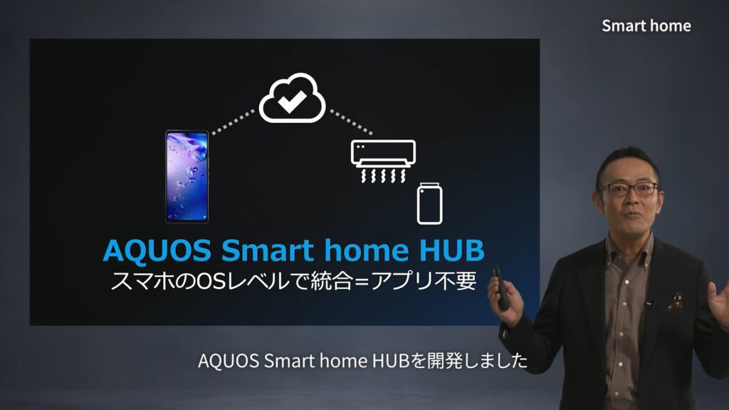 また、スマートフォンで当社のAIoT家電を簡単に操作できる「AQUOS Smart home HUB」についても紹介。2021年11月以降、AQUOS全シリーズ※3で使用可能にする旨を表明しました。