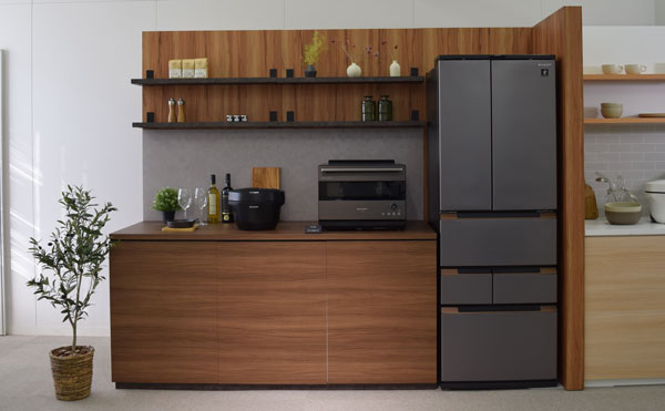 <AX-RA20>は本体ドア部分に質感の高いメタル素材を採用。メタル素材とガラス素材を組み合わせ、ガラスと一体化したブラック液晶によるすっきりとしたデザインで、こだわりのキッチン空間にも馴染みやすい、ダークメタル・ライトメタルのカラーを揃えました。また、庫内が30Lの大容量ながら高さを抑えた設計で、一般的なキッチンボードにも設置可能です。