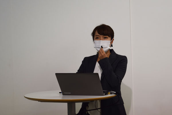 次に、同 主任の片山さんより、「COCORO KITCHEN」「まかせて調理」の専用キーなど新製品の特長について、具体的なメニュー名や操作方法の説明を交えながら紹介しました。また、今回の新製品発売により、ヘルシオの全モデルがAIoT化した事を訴求するとともに、発表会場では、さまざまなキッチンに馴染みやすい本体デザインについて、冷蔵庫と合わせた展示演出を行いました。