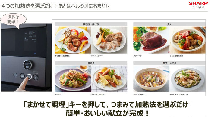 好みの食材・分量を角皿に載せ、「まかせて調理」キーを押し、調理モード「網焼き・揚げる」「焼く」「炒める」「蒸す・ゆでる」を選ぶだけで、低温の食材により多くの熱が加わる過熱水蒸気の特性により、状態(冷凍・冷蔵・常温)が異なる複数の食材を同時に調理できます。