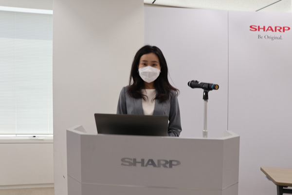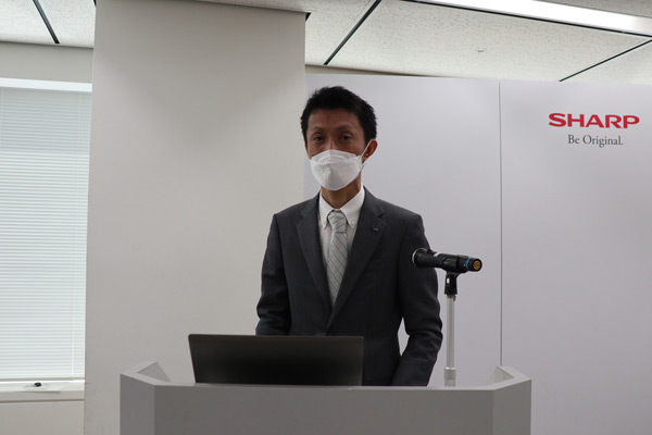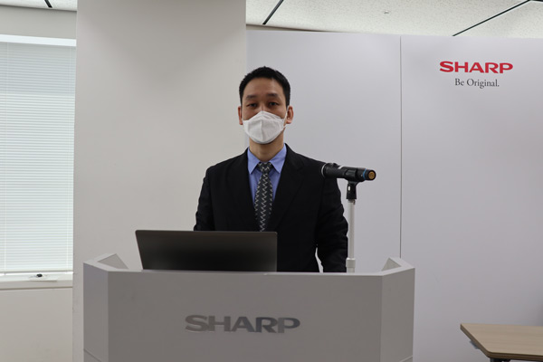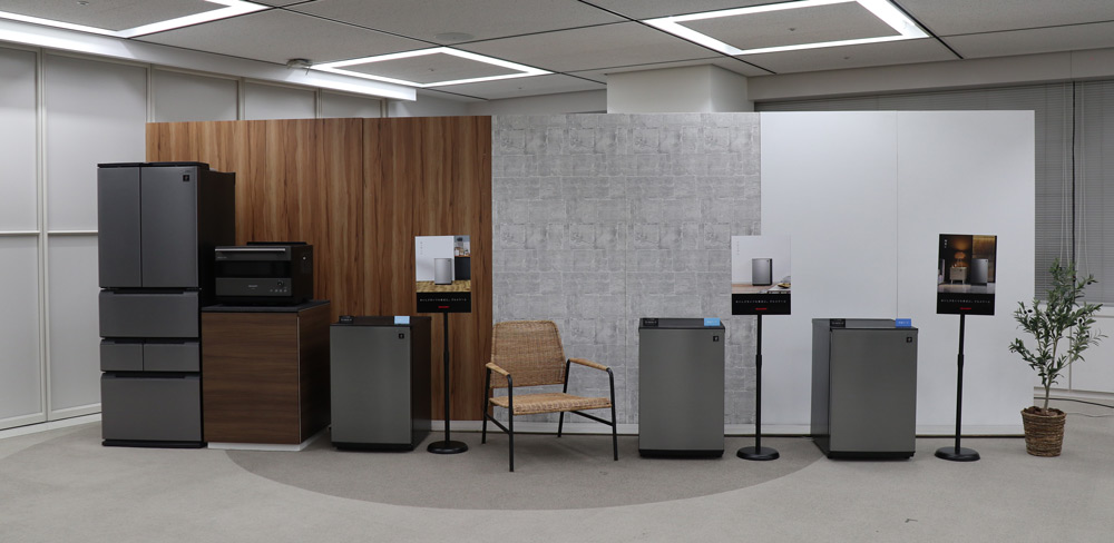 続いて、同 国内デザインスタジオ 課長の一色さんから、大型冷蔵庫やヘルシオのダークメタル系のカラーが高評価をいただいていることを説明し、新製品では、リビングや寝室などにも設置することを想定したデザインと、家具とのバランスを考慮した高さ設計をしたことを紹介しました。