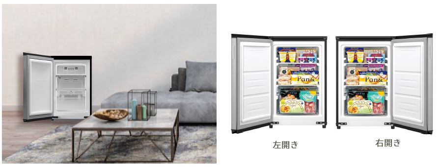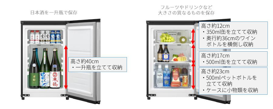 インテリアになじみやすい高品位メタルドアデザインと、部屋のレイアウトに応じてドアの開閉方向を変更できる「つけかえどっちもドア」を採用しました。また、上段と中段の棚は可動式で、50mm上方向に変更可能です。中段棚とケースを外せば、背の高い酒瓶も立てて置けます。