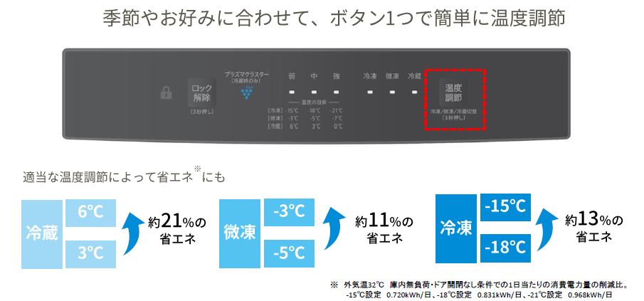 シャープ独自の、冷凍・微凍・冷蔵3モードに対応。収納したい食品や飲料に応じて、9段階の細かな温度切替が可能です。季節やお好みに合わせて、ボタン1つで簡単に温度調節できます。