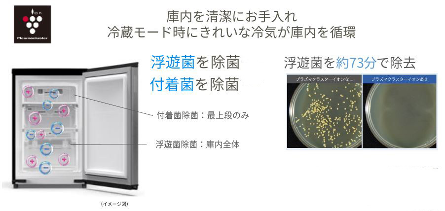 冷蔵モード時に、浮遊菌や付着菌を除菌する「プラズマクラスター」を搭載。きれいな冷気が庫内を循環します。